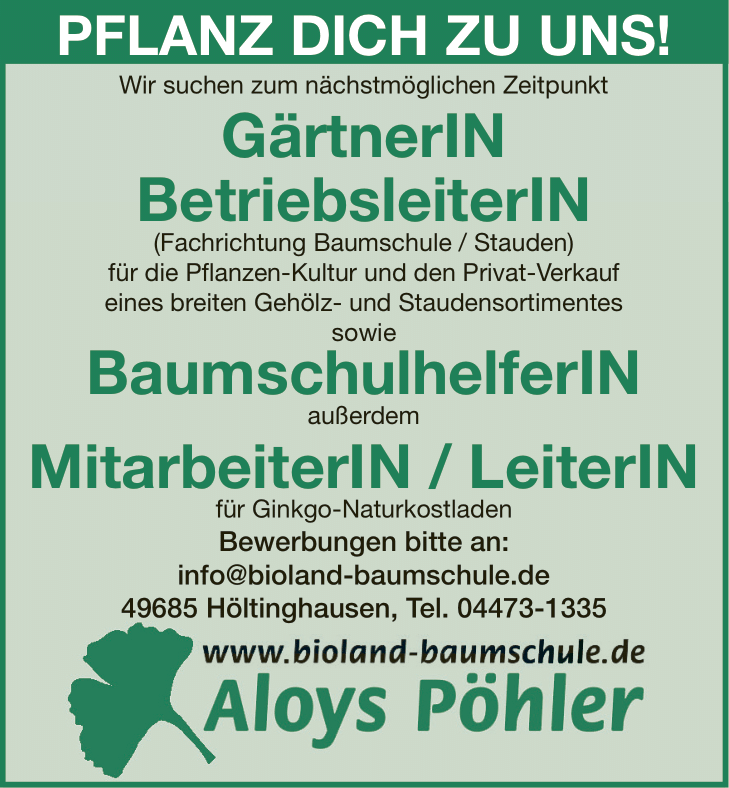 Fachrichtung Baumschule / Stauden, idealerweise Meister/in o.ä.